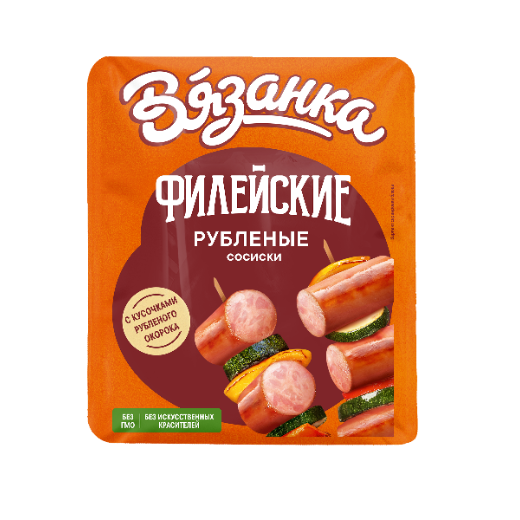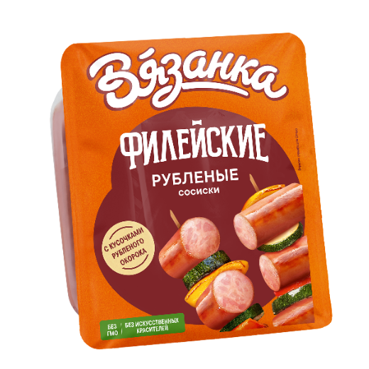 Сосиски с кусочками рубленого филе свиного окорока, благодаря которым продукт становится особенно сочным и сытным.