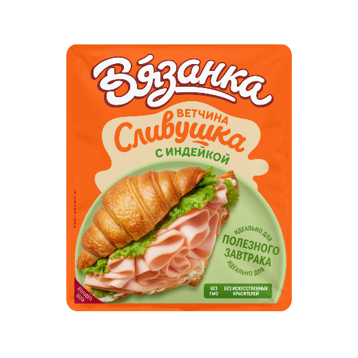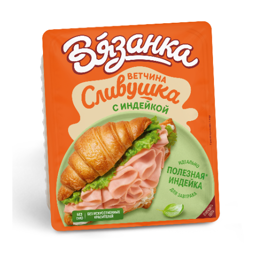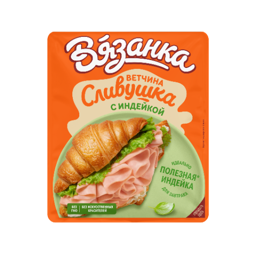 Ветчина «Сливушка с индейкой» с полезным филе индейки и нежным сливочным вкусом.