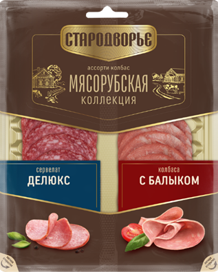 · Ассорти колбас «Мясорубская коллекция» – изысканный сервелат «Делюкс» и деликатесная колбаса с балыком. Это готовое ассорти для красивой и разнообразной подачи без лишних усилий.