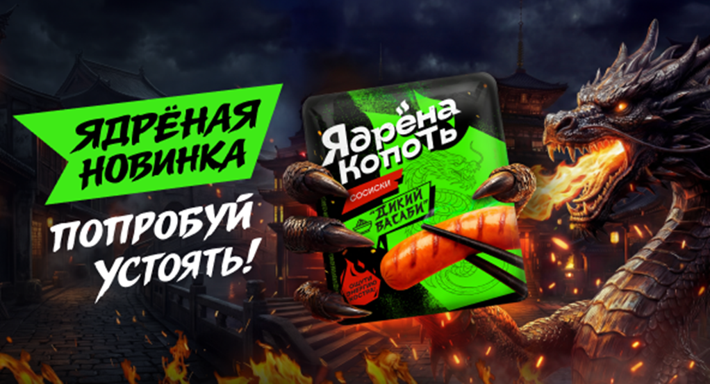 Бренд «Ядрёна копоть» представляет на рынке три новых продукта: с приправой васаби, а также с авторскими смесями специй. Продажи сосисок «Дикий васаби», «Перечный стейк» и «Мясо на углях» стартовали в федеральных торговых сетях и ведущих сервисах онлайн-заказа продуктов питания России.